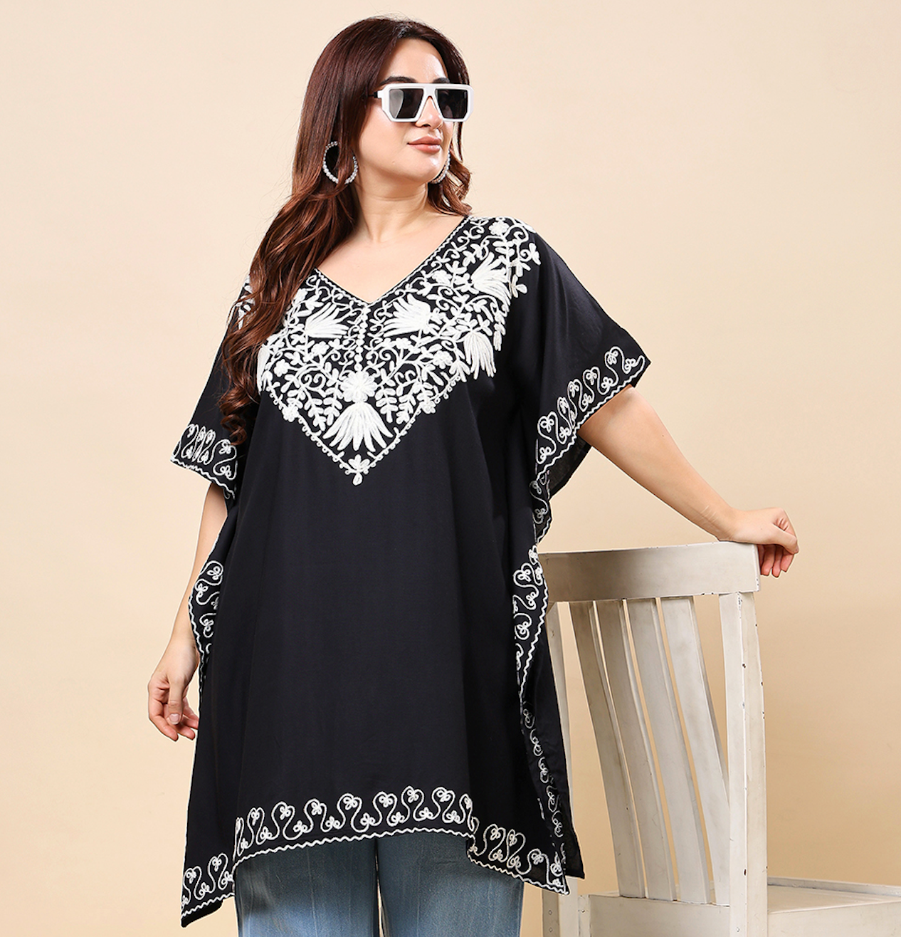 Elevate your everyday style with this elegant black tunic featuring white floral embroidery. Designed in a free-flowing silhouette, it combines comfort and sophistication perfect for casual outings, festive gatherings, or workwear. Available in XXL–6XL sizes for the perfect plus-size fit.