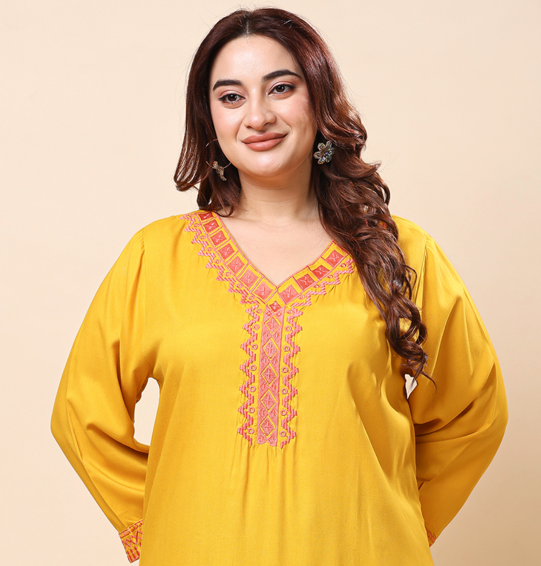 Add a bold splash of color to your wardrobe with this rayon mustard tunic, detailed with intricate pink embroidery on the neckline and cuffs. Its relaxed plus-size fit ensures comfort while keeping your look stylish for festive gatherings, office wear, or casual outings.