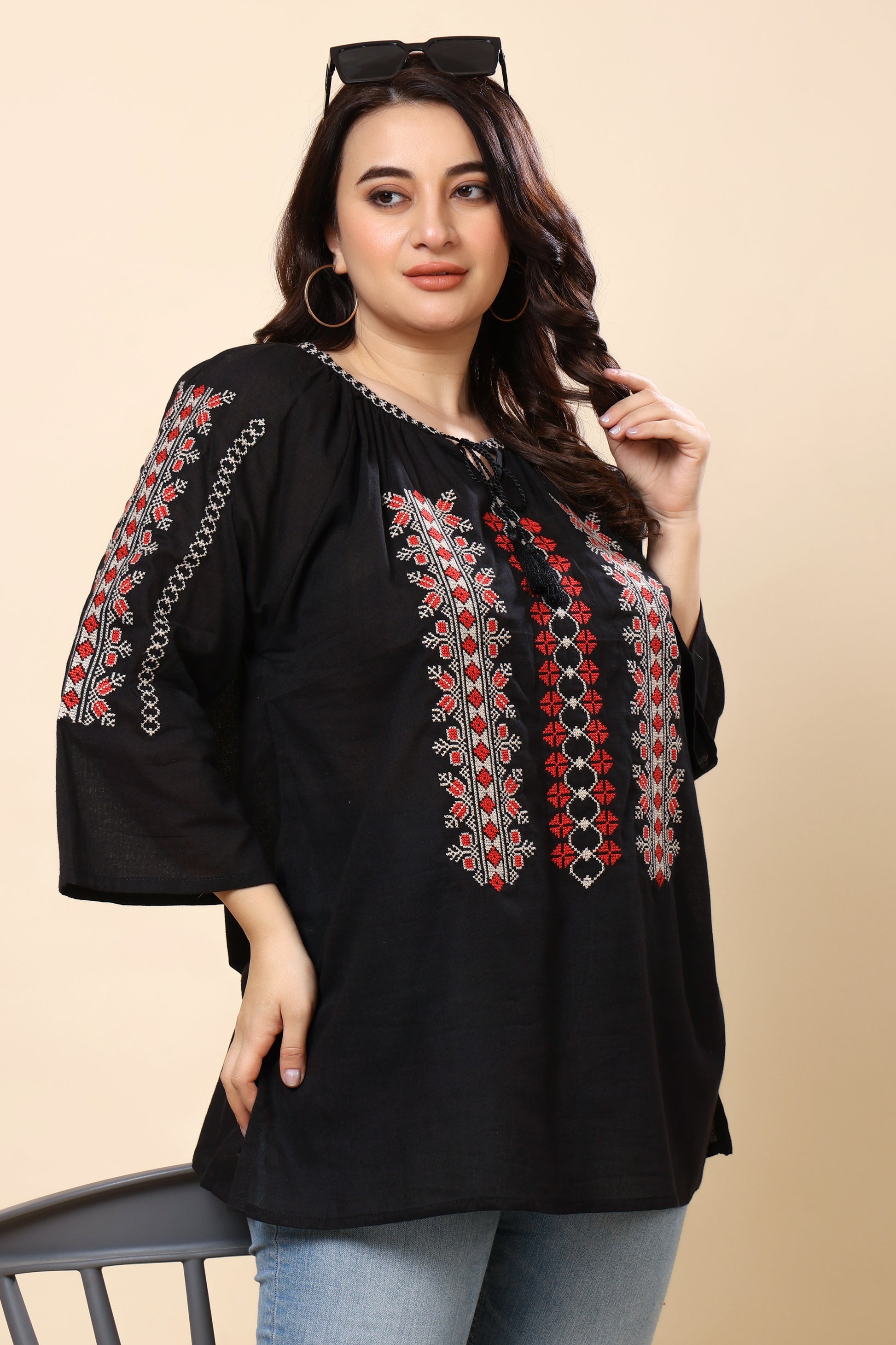 Black Embroidered Boho Top for Women – 3/4 Sleeves | Sizes S to 6XL | Casual & Everyday Wear