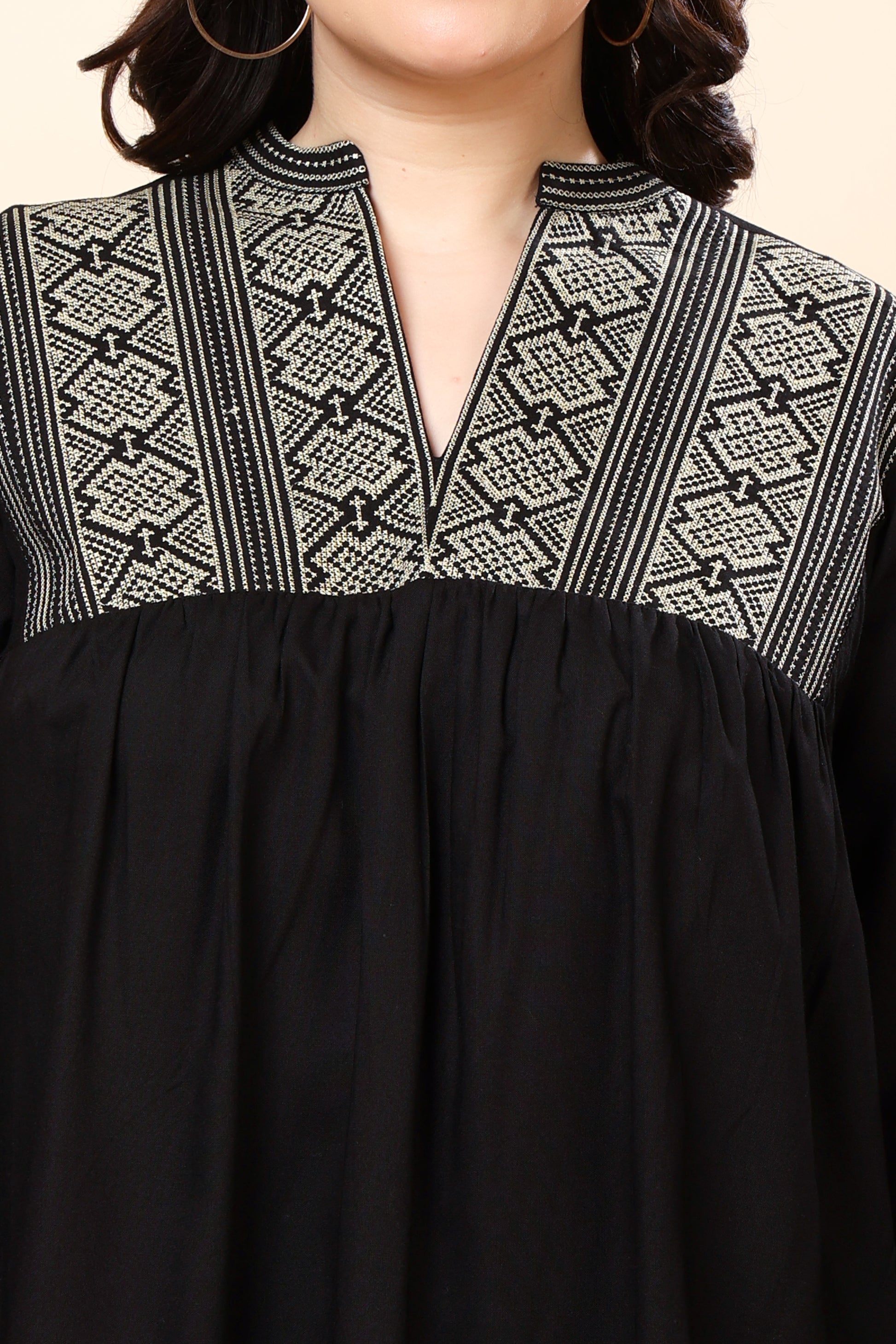 A modern black embroidered top designed for effortless everyday styling. The contrasting thread work on the yoke adds handcrafted appeal, while the airy gathers and long sleeves ensure ease of movement and comfort throughout the day.