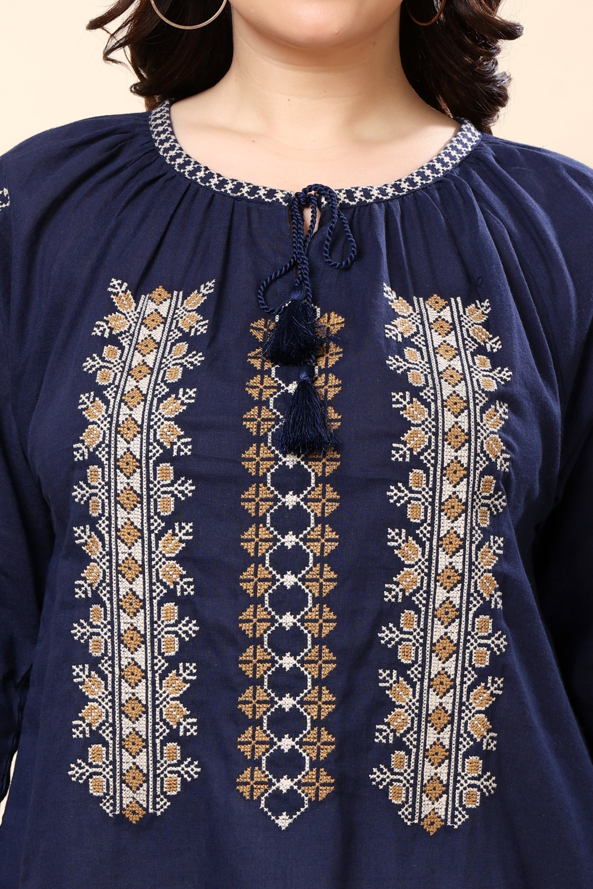 A beautifully detailed navy embroidered top designed for comfortable everyday wear. The multicolor thread embroidery on the front and sleeves adds an artisanal touch, while the soft woven fabric offers a breathable and relaxed feel throughout the day.
