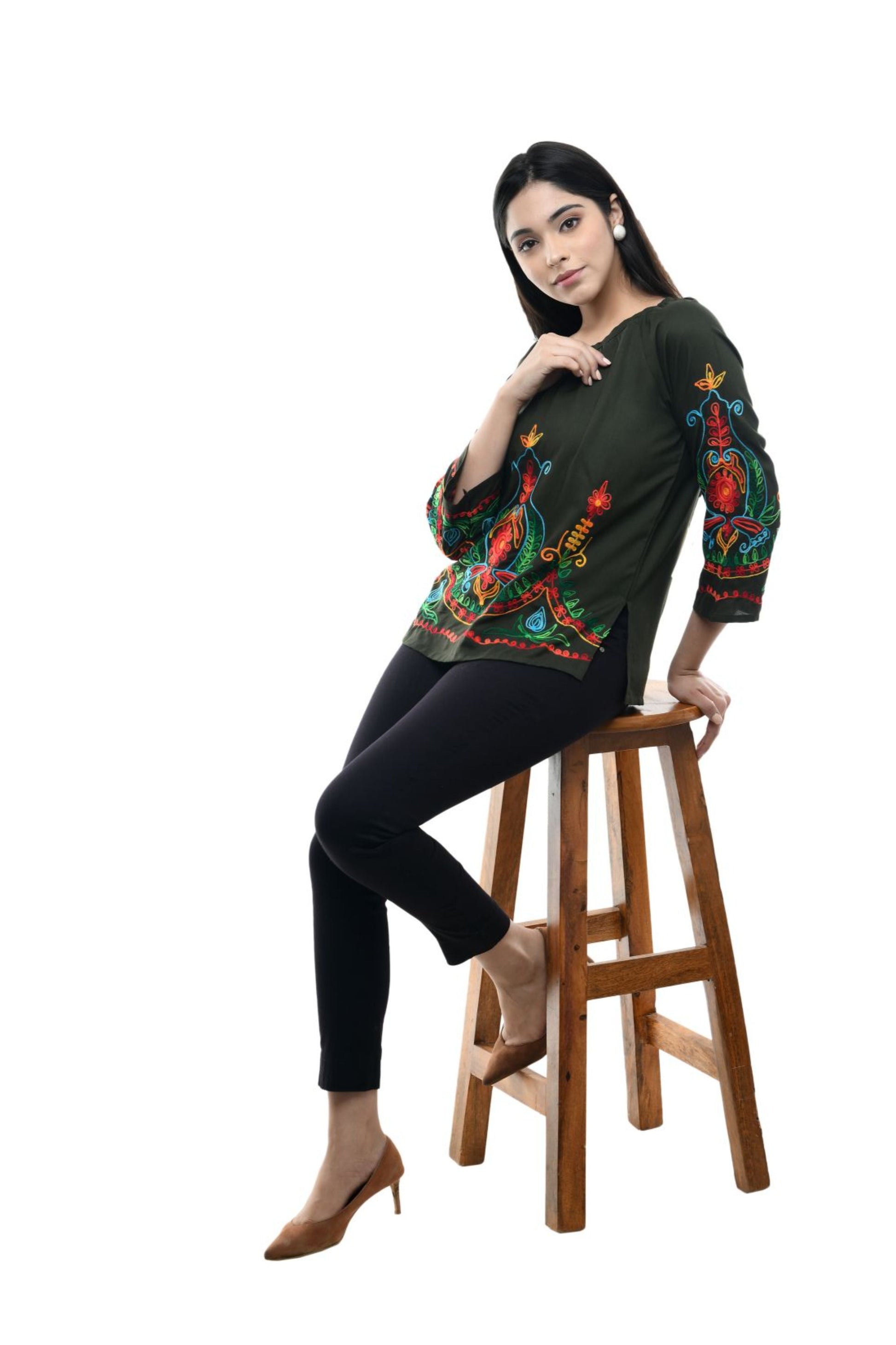 Add a pop of vibrant charm to your everyday wardrobe with this olive green multicolor boho embroidered tunic top. Crafted from soft premium cotton, it delivers all-day comfort while the rich color palette and handcrafted-style motifs make it truly stand out.