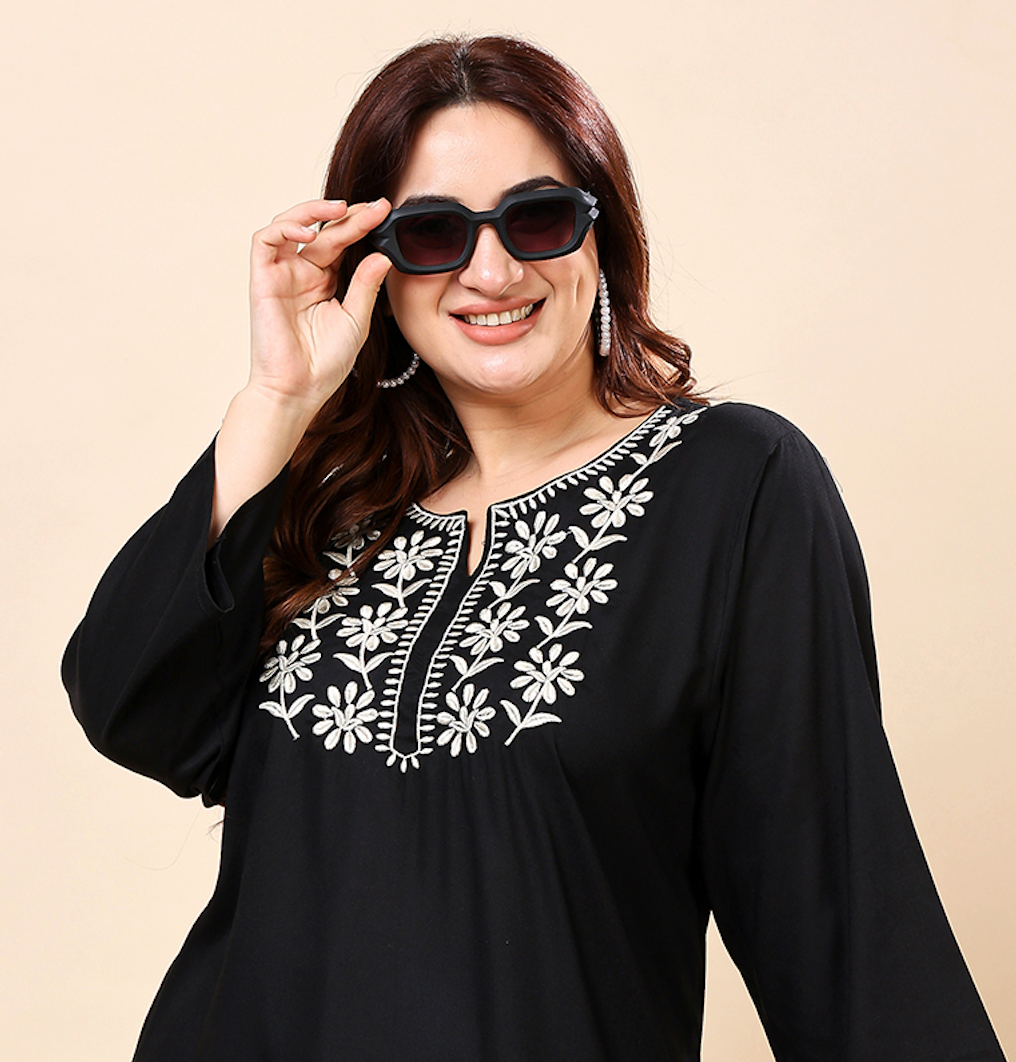 Step into effortless style with our black embroidered tunic, designed for plus-size women who love comfort with a touch of class. Featuring delicate white thread embroidery on a soft rayon base, it’s perfect for workdays, casual outings, or festive evenings.